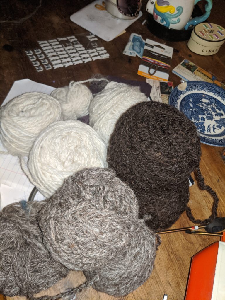 Three different colour yarns, all natural, spun from same jacob sheep fleece