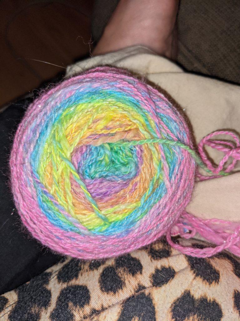 Previous skein of yarn, now caked, ready to knit